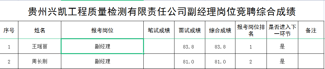 貴州興凱工程質(zhì)量檢測有限責(zé)任公司2022副經(jīng)理崗位競聘綜合成績名單公示