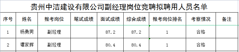 附件:貴州中潔建設(shè)有限公司副經(jīng)理崗位競(jìng)聘擬聘用人員名單